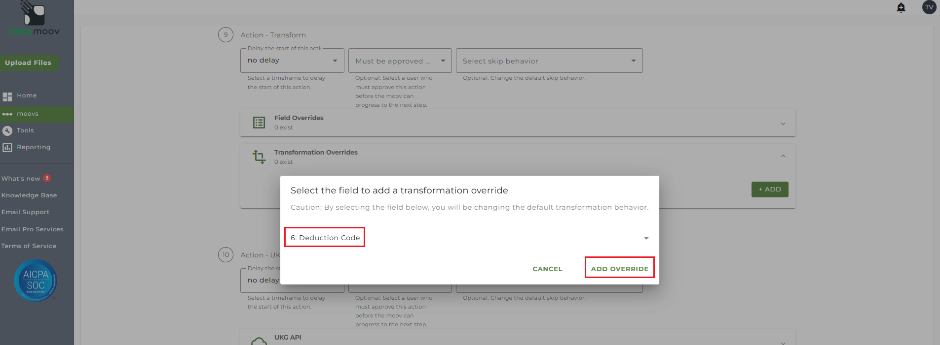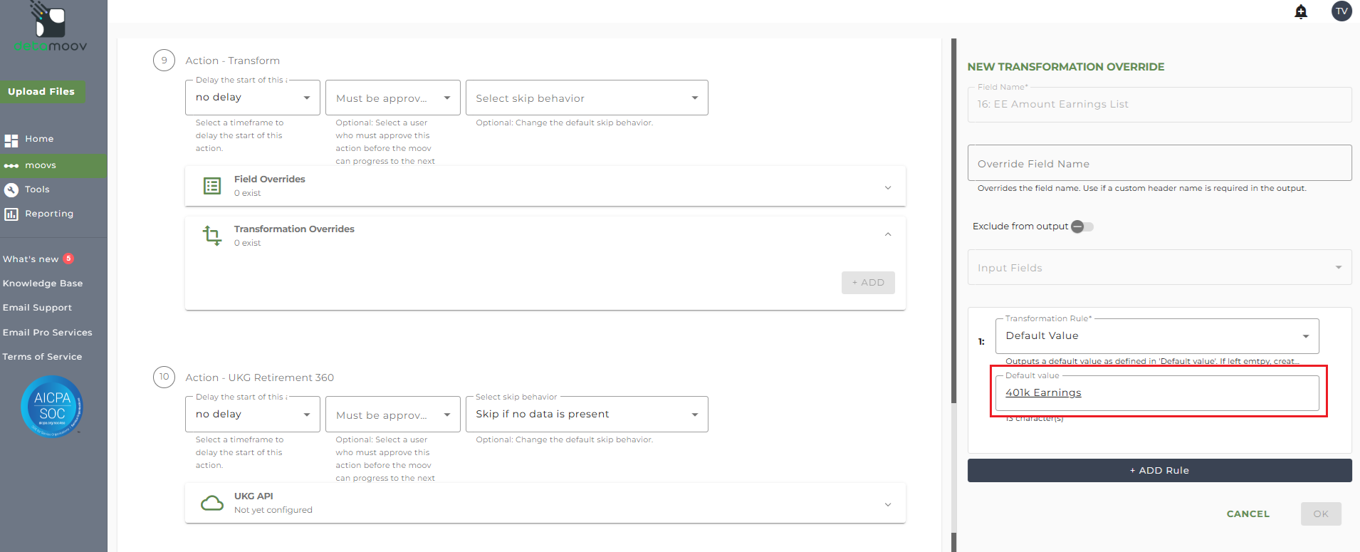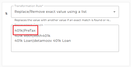 Example 1: detamoov receives the John Hancock deduction code PTXP and converts it to 401k. A transformation is then performed to convert 401k to the UKG code. By default, this value would be 401k. If your client's deduction code is different in UKG, say your UKG deduction code is PreTax instead of 401k, then you will need to provide a transformation override for the Deduction Code field.