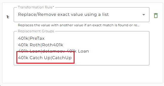 Example 2: detamoov receives the John Hancock deduction code PTCP and converts it to 401k Catch Up. Since we don't set a default for this code when converting to UKG, you will need to provide a transformation override to include the replacement group 401k Catch Up|[your UKG Code].
