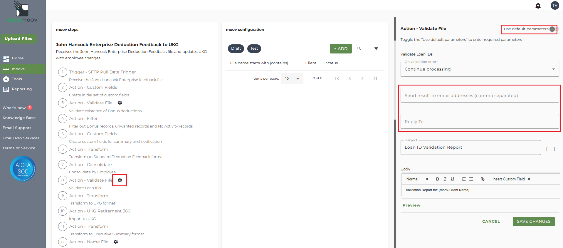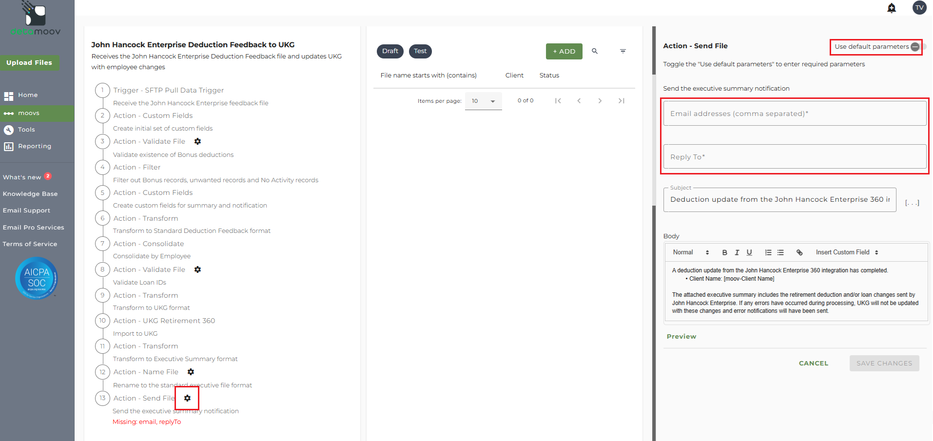 Note: these settings apply to any client configuration you set up for this specific moov. You also have the ability to configure the send file step for each client configuration if you wish to add or remove email addresses per client.