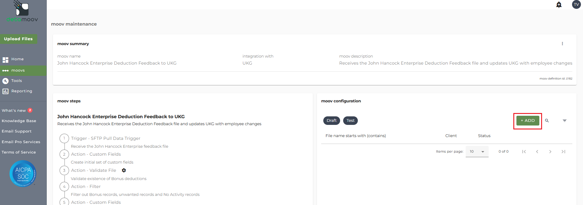 Once the John Hancock Enterprise Deduction Feedback to UKG moov has been added to your account, access the moovs section on the left side menu and click on the John Hancock Enterprise Deduction Feedback to UKG moov.