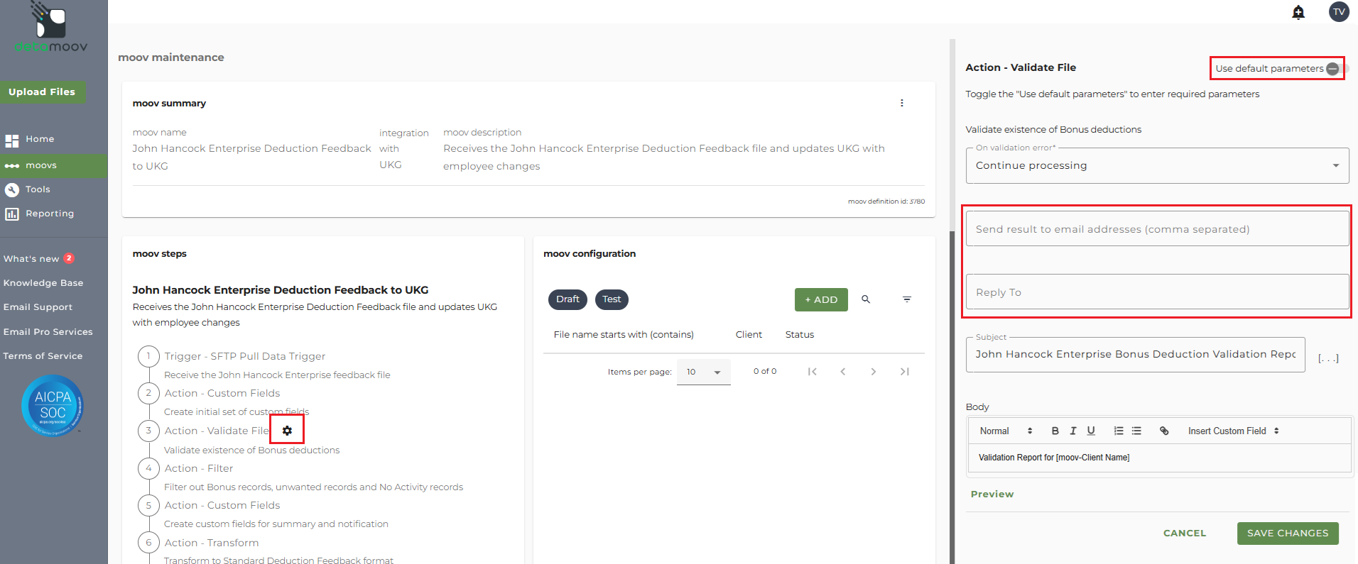 To configure the Bonus Records validation step, click the cog icon on Step 3: Action - Validate File on the left. Then toggle the "Use default parameters" off and enter in the email addresses you would like to receive the notification. If you would like to enter multiple email addresses, separate them with a comma. A Reply to email is also required in the event that a recipient of the notification replies to the email.