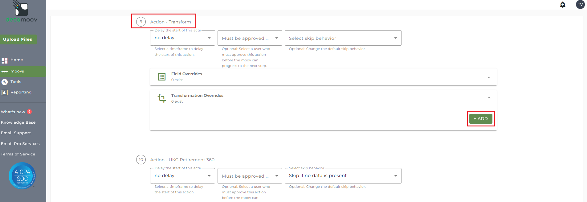To provide a transformation override, locate step 9: Action - Transform, expand the Transformation Overrides panel and click ADD.