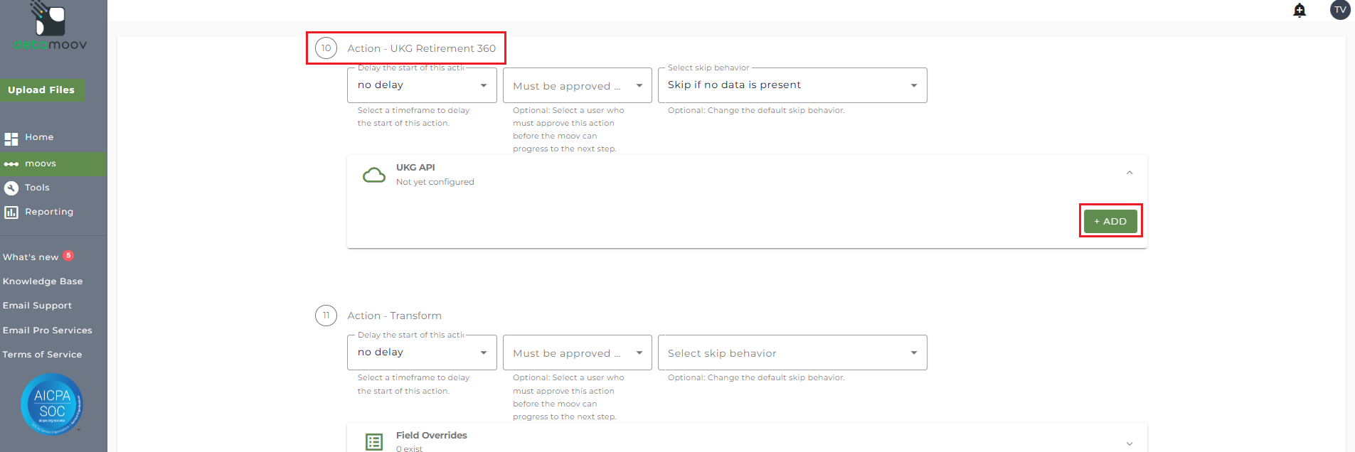 To configure the UKG Retirement 360 step for you client, locate the Action - UKG Retirement 360 step, expand the UKG API panel and click ADD.