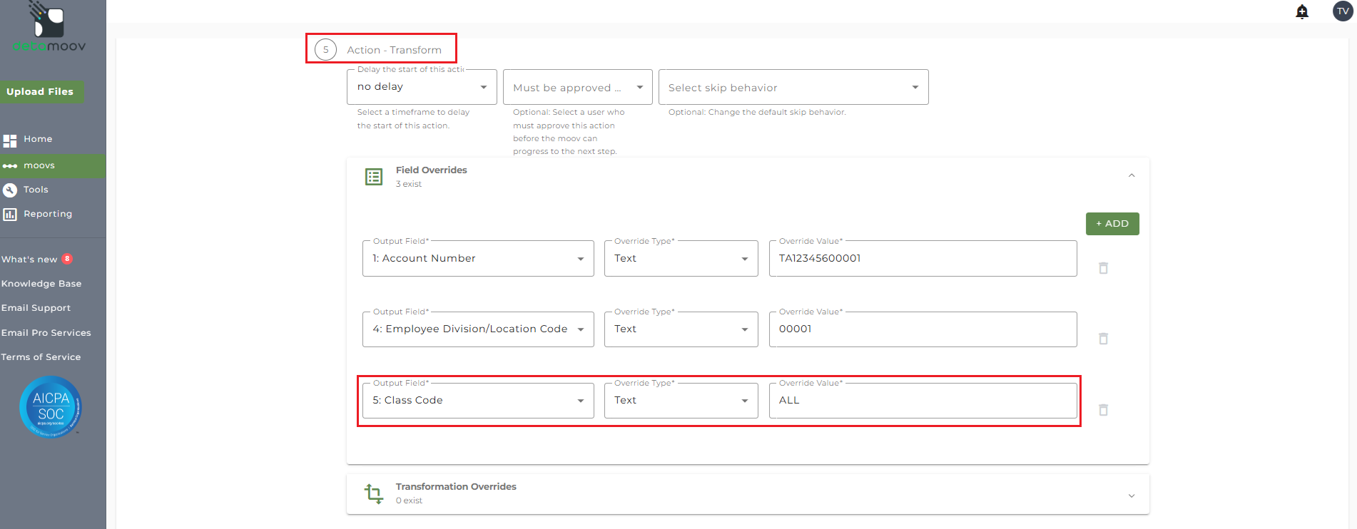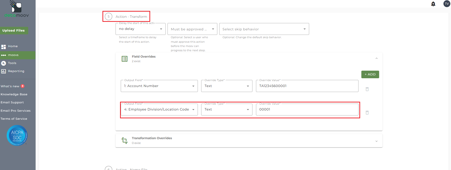To provide the override custom fields, locate the Action - Transform step, click the Field Overrides panel, and click the Add button. Then select the appropriate field from the Output Field dropdown, change the Override Type to Custom Field, and then select the Custom field from the dropdown menu as shown below: