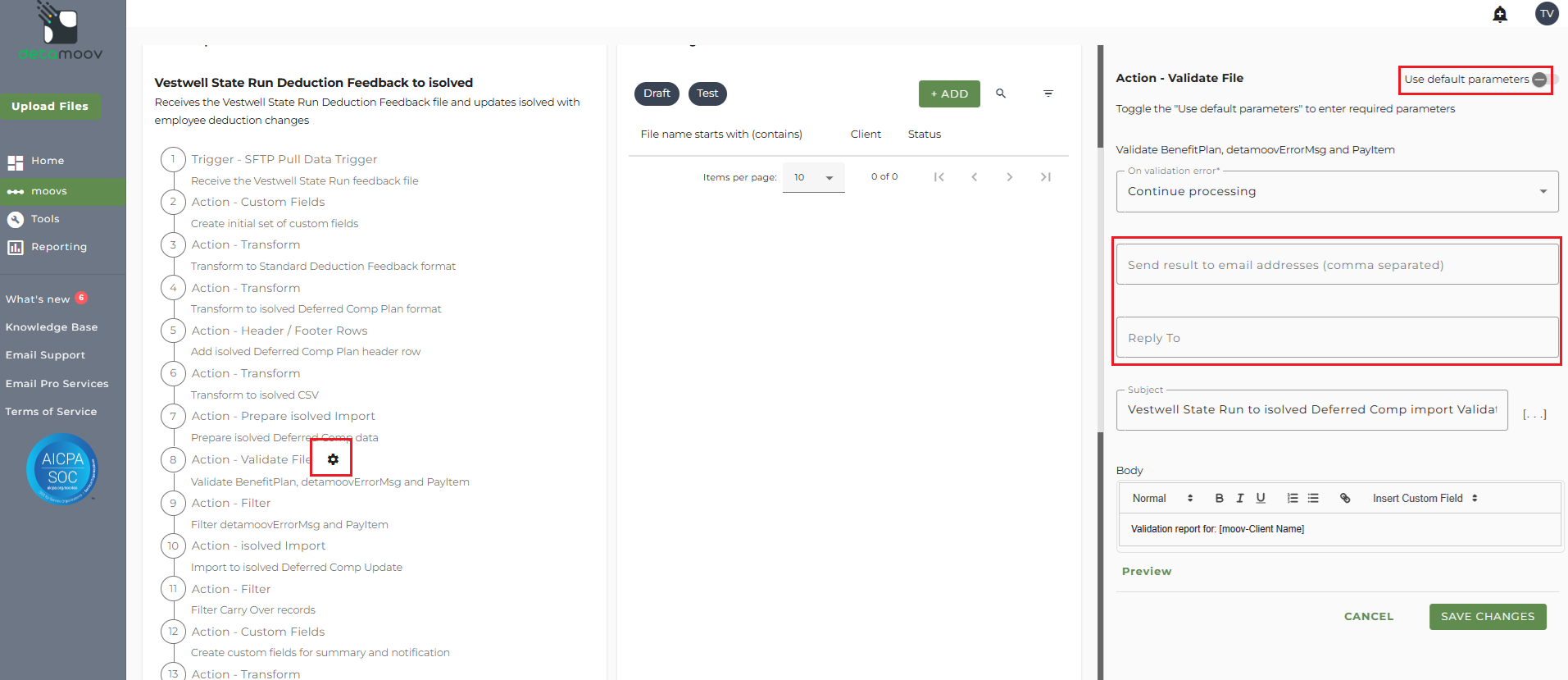 To ensure that you receive the validation notifications, click the cog icon under the step 8: Action - Validate File on the left. Then toggle the "Use default parameters" off and enter in the email addresses you would like to receive the notification. If you would like to enter multiple email addresses, separate them with a comma. A Reply to email is also required in the event that a recipient of the notification replies to the email.
