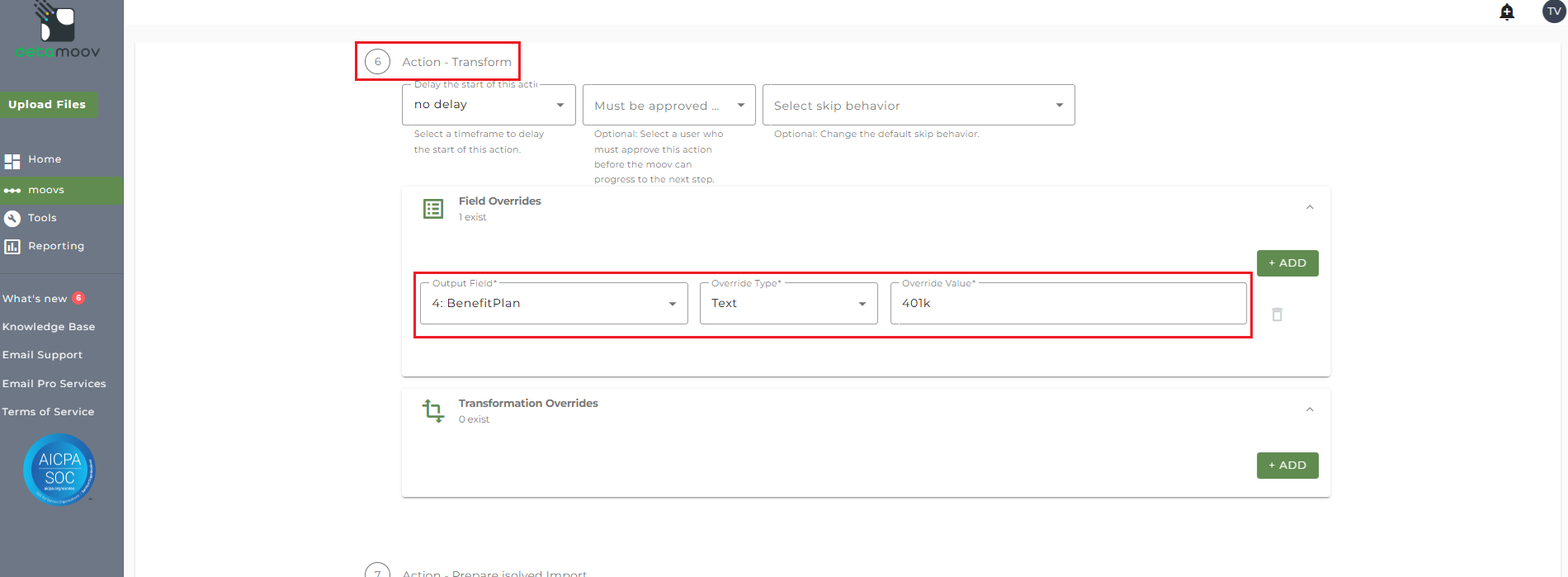 Before detamoov can prepare the Vestwell deduction data for import, you must provide your client's isolved Benefit Plan. To create a field override, locate step 6: Action - Transform and expand the Field Overrides section.