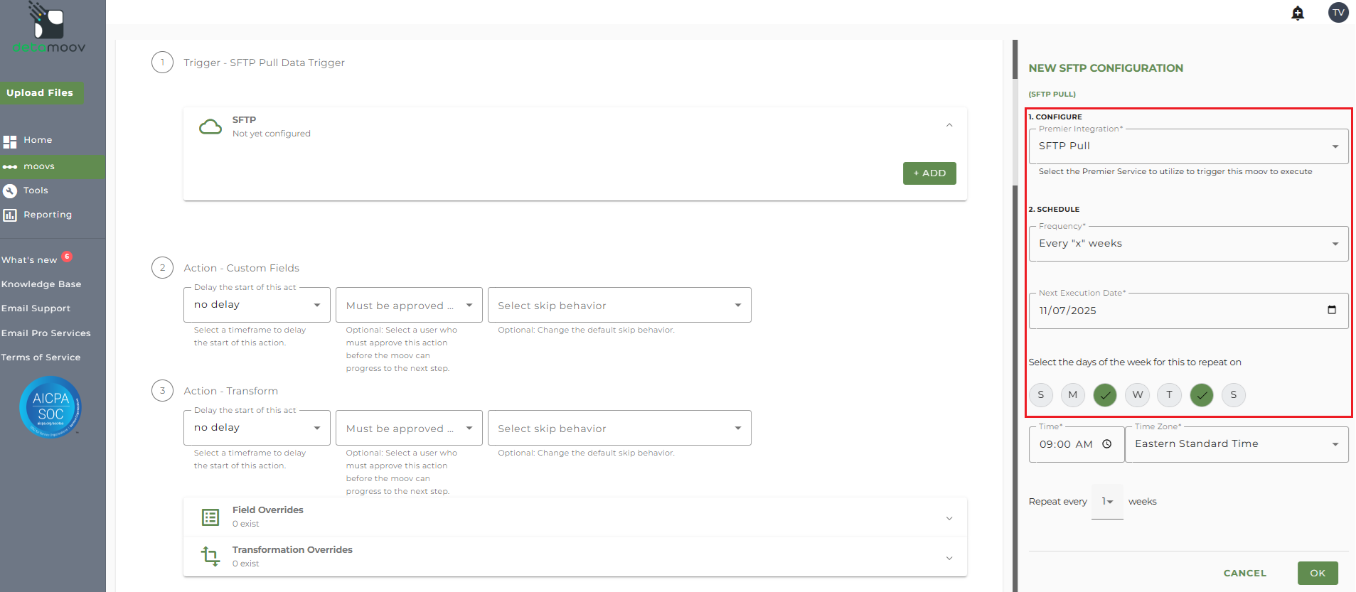 On the New SFTP Configuration section on the right, select the SFTP Pull option from the Premier Integration menu. Then select either "Every X weeks" or "On certain days of the month", depending on how often you would like detamoov to check for new deduction files. We recommend that you check for feedback files at least twice a week. In the example below, we have set up a schedule to check for files twice a week on Tuesdays and Fridays.