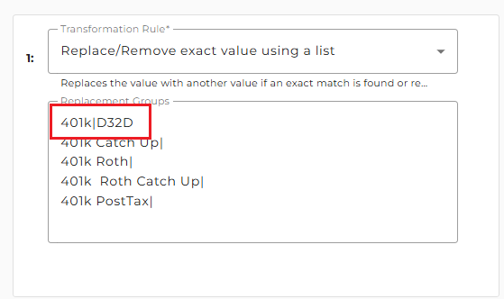 On the side panel that appears, in the Replacement Groups field, replace the right side of 401k| with your client's deduction code.