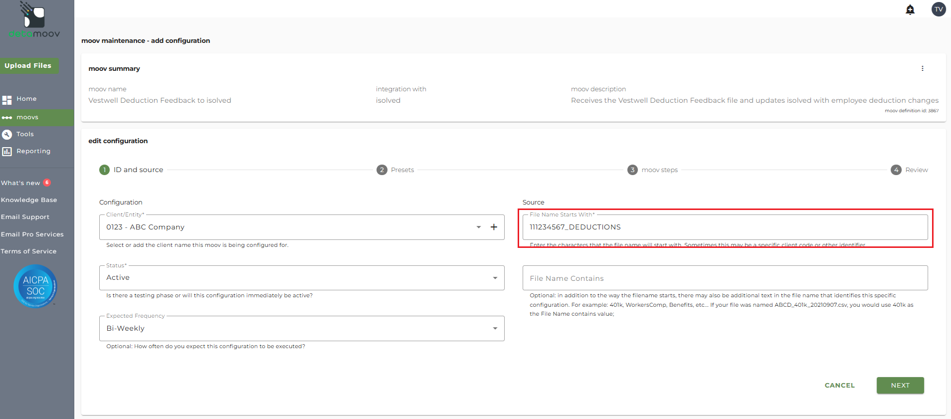 This article describes how to configure a client for the Vestwell Deduction Feedback to isolved moov definition used for 360 integration. Each client configuration will vary based on their plan specification and will need to be configured accordingly.