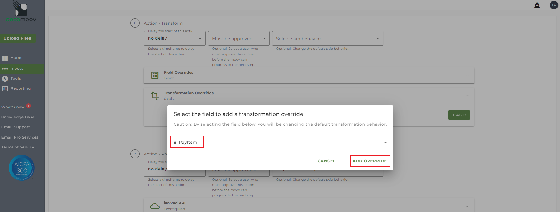 NOTE: There are 4 separate Transform steps on the Vestwell Deduction Feedback to isolved moov. Make sure are you creating the field override on step 6: Action - Transform.