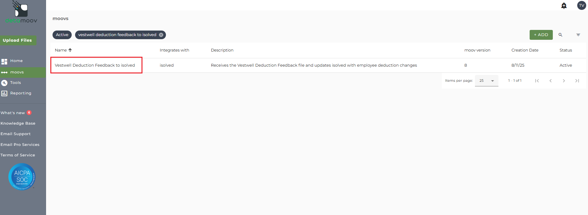 Once the Vestwell Deduction Feedback to isolved moov has been added to your account, access the moovs section on the left side menu and click on the Vestwell Deduction Feedback to isolved moov.
