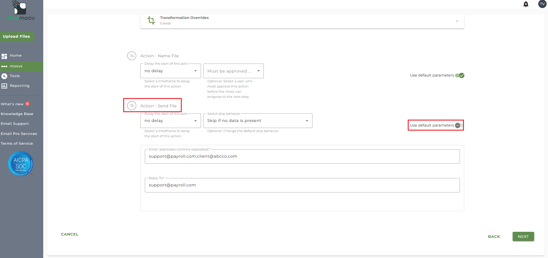 Note: these settings apply to any client configuration you set up for this specific moov. You also have the ability to configure the send file step for each client configuration if you wish to add or remove email addresses per client.