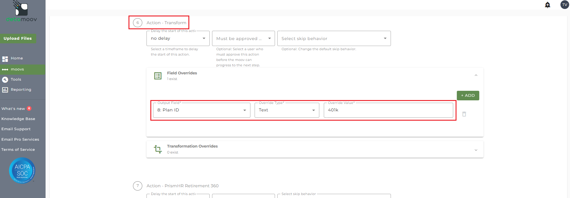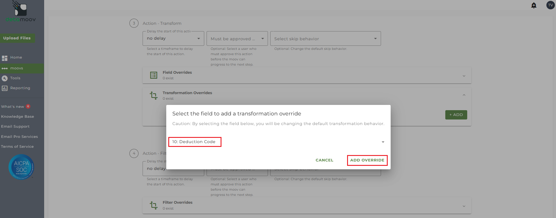 NOTE: There are 4 separate Transform steps on the Transamerica Large Market Deduction Feedback to PrismHR moov. Make sure are you creating the field override on step 6: Action - Transform.