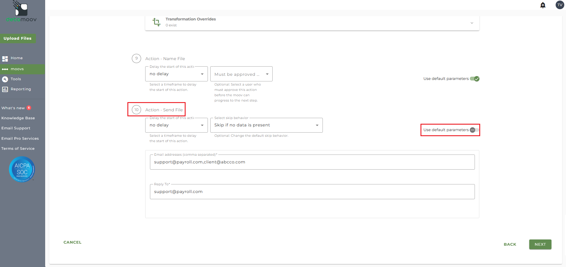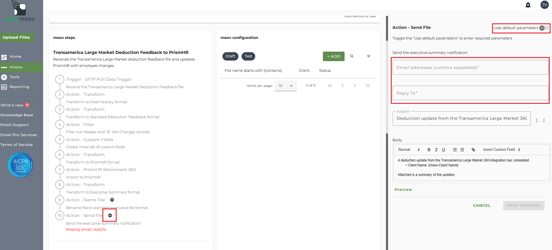 Note: these settings apply to any client configuration you set up for this specific moov. You also have the ability to configure the send file step for each client configuration if you wish to add or remove email addresses per client.