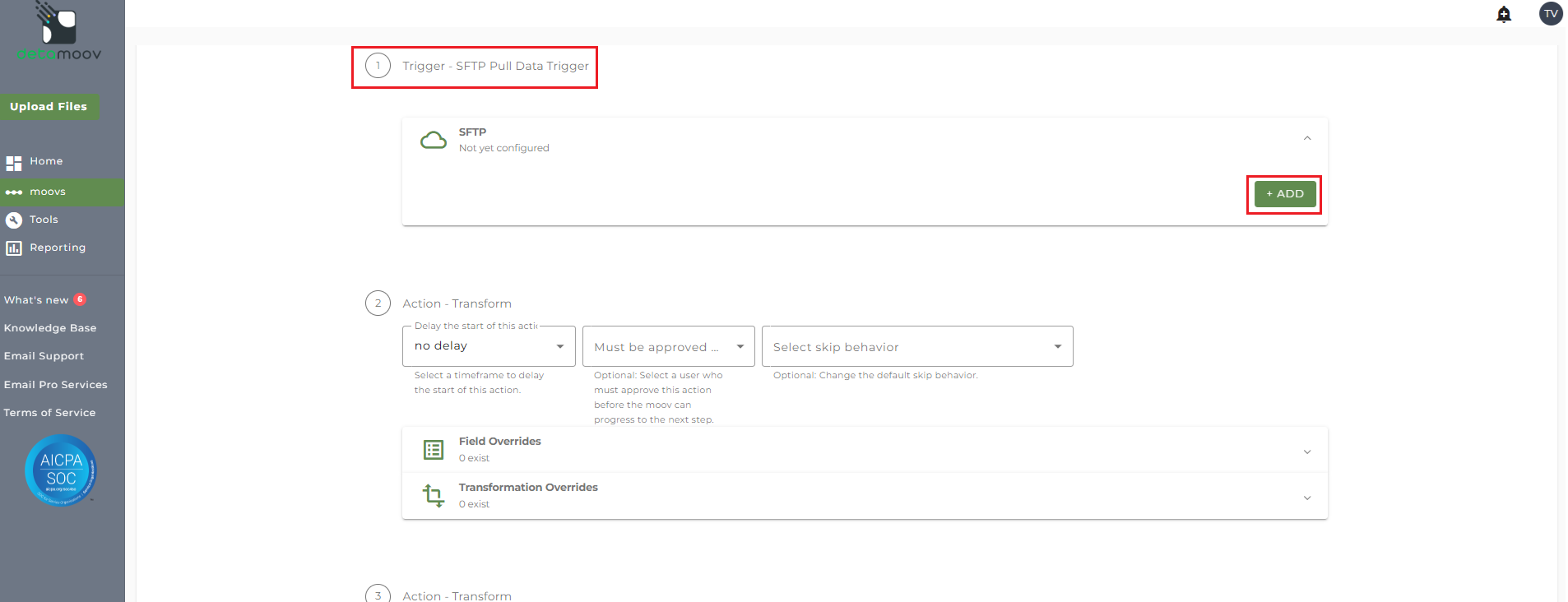 Transamerica makes the feedback files available for your client based on their payroll schedule. To ensure that the feedback files are pulled, you will need to automate the 360 integration by configuring the SFTP schedule. Click the SFTP banner under the Trigger - SFTP Pull Data Trigger step and click Add.