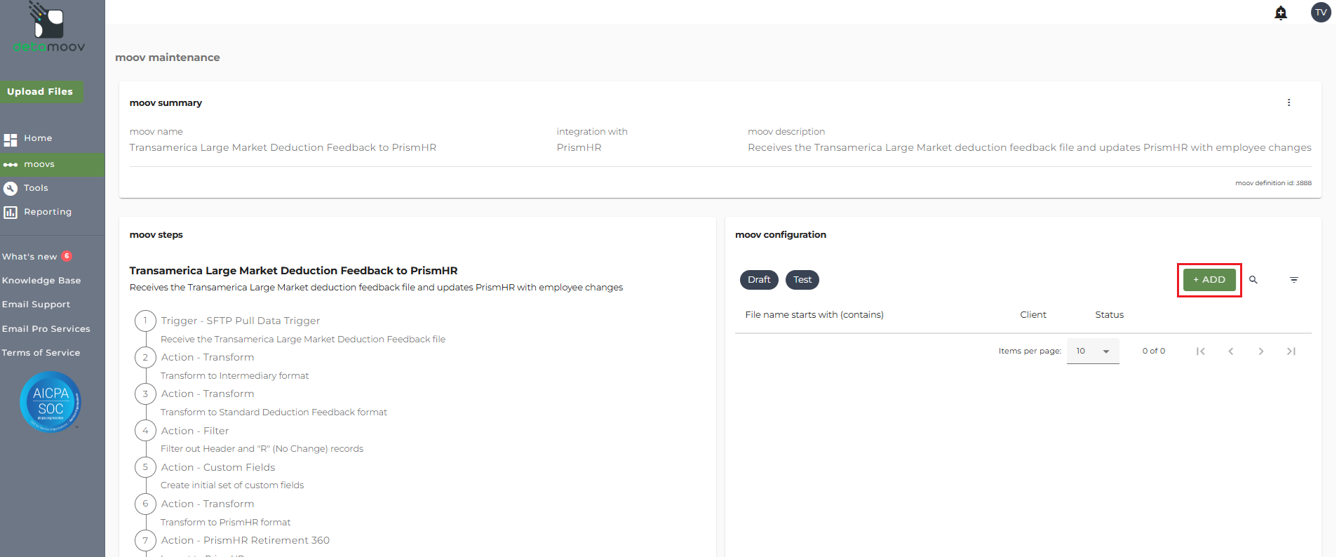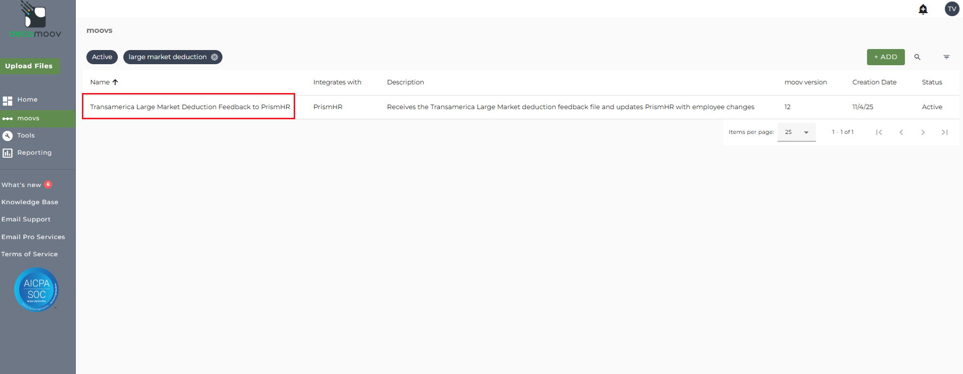 Once the Transamerica Large Market Deduction Feedback to PrismHR moov has been added to your account, access the moovs section on the left side menu and click on the Transamerica Large Market Deduction Feedback to PrismHR moov.