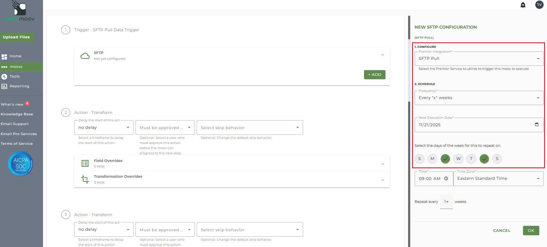 On the New SFTP Configuration section on the right, select the SFTP Pull option from the Premier Integration menu. Then select either "Every X weeks" or "On certain days of the month", depending on how often you would like detamoov to check for new feedback files. We recommend that you check for feedback files at least twice a week. In the example below, we have set up a schedule to check for files twice a week on Tuesday and Friday.