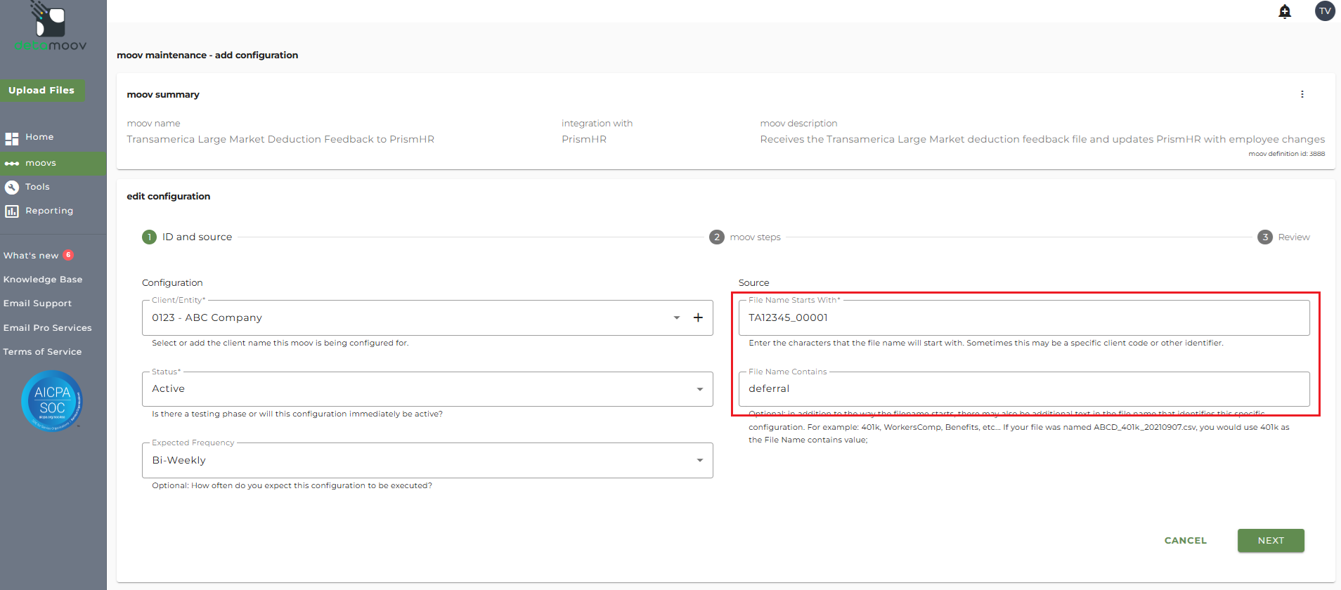 After the PrismHR Premier Integration has been activated on your account, please add the Transamerica Large Market Deduction Feedback to PrismHR moov to your account by following these steps.
