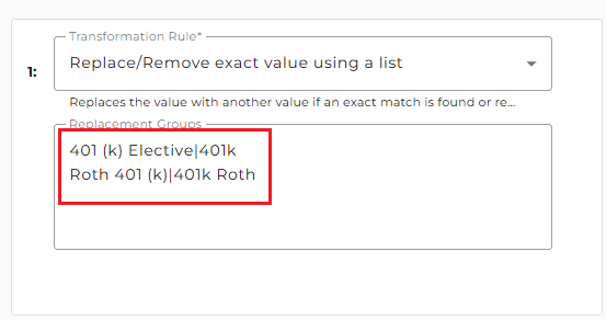 On the side panel that appears, in the Replacement Groups field, replace the left side of |401k with your client's deduction codes and then click OK.