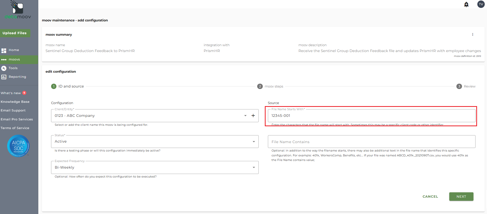 Note: make sure that the File Name Starts with field matches as this can cause issues pulling the Sentinel feedback file and updating PrismHR.