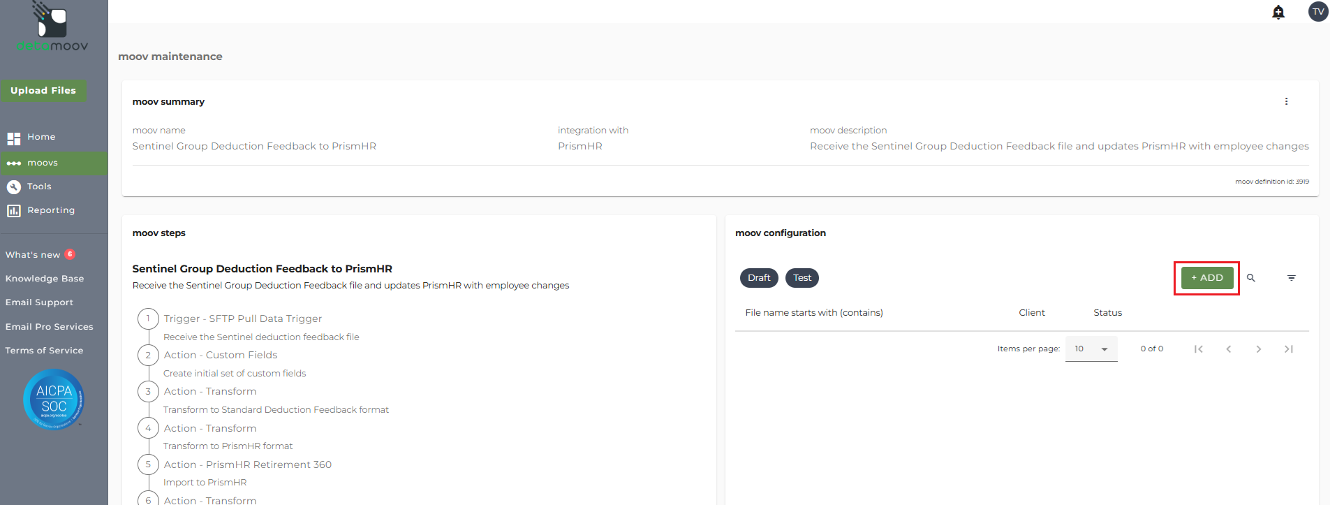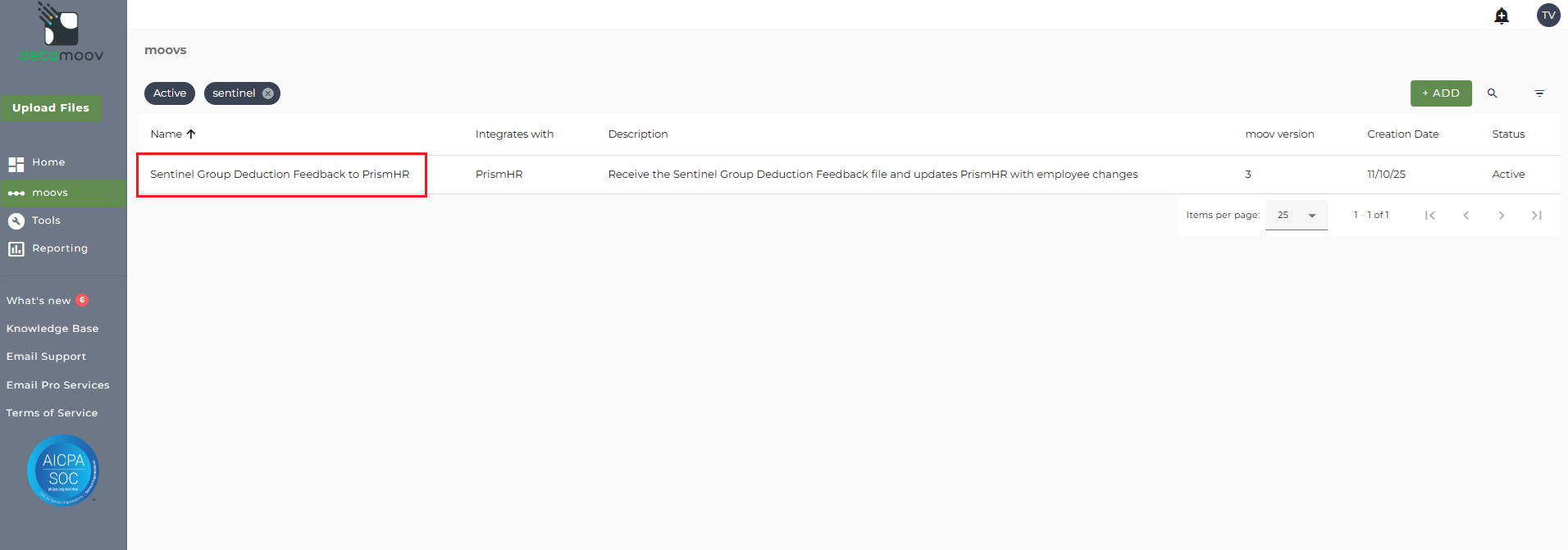 Once the Sentinel Group Deduction Feedback to PrismHR moov has been added to your account, access the moovs section on the left side menu and click on the Sentinel Group Deduction Feedback to PrismHR moov.