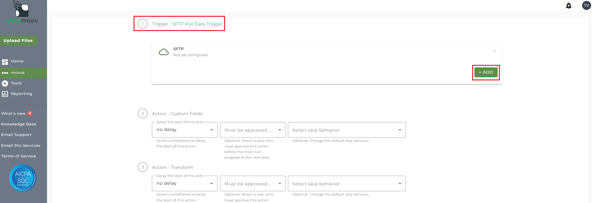Sentinel makes the feedback files available for your client every day at 4:30pm ET only if there are changes made by an employee. To ensure that the feedback files are pulled, you will need to automate the 360 integration by configuring the SFTP schedule. Click the SFTP banner under the Trigger - SFTP Pull Data Trigger step and click Add.