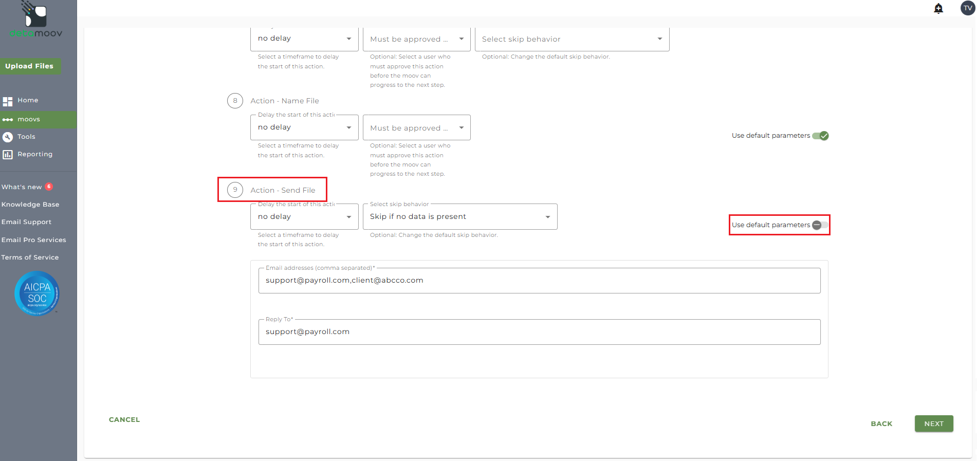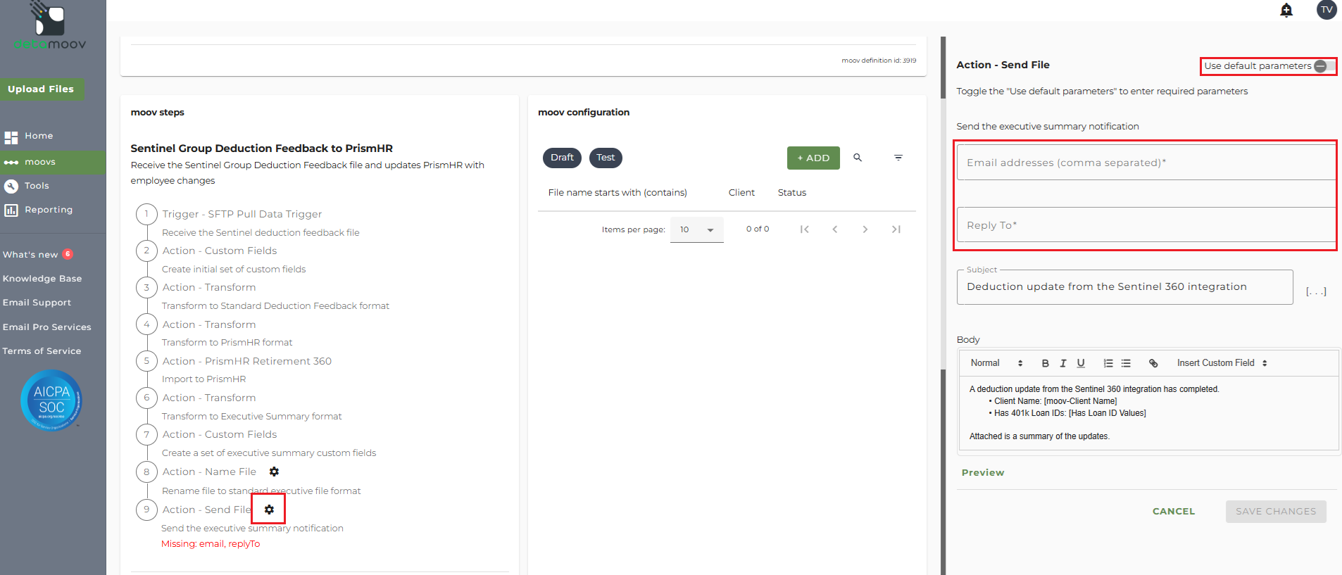 Note: these settings apply to any client configuration you set up for this specific moov. You also have the ability to configure the send file step for each client configuration if you wish to add or remove email addresses per client.