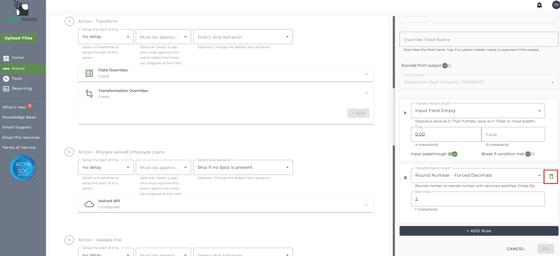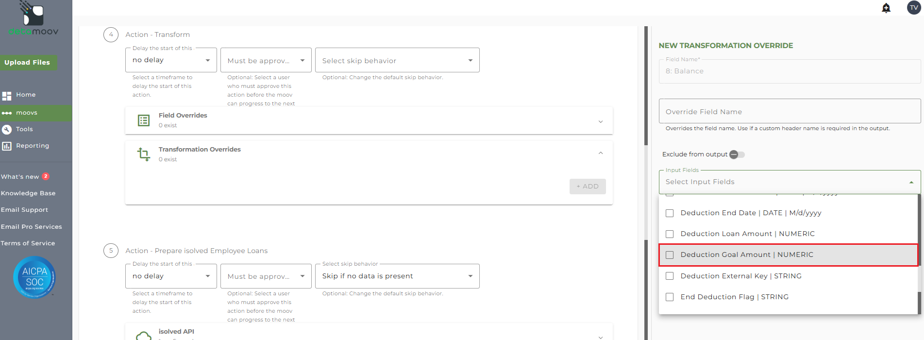 Note: The PCA Loan Feedback to isolved Loan Deduction Update moov contains three separate Transform steps. The following information relates to step 4: Action - Transform only.