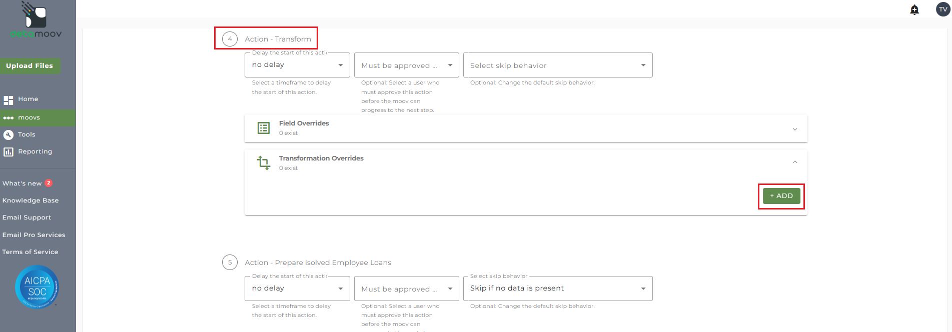 To provide a transformation override, locate step 4: Action - Transform, expand the Transformation Overrides panel and click ADD.