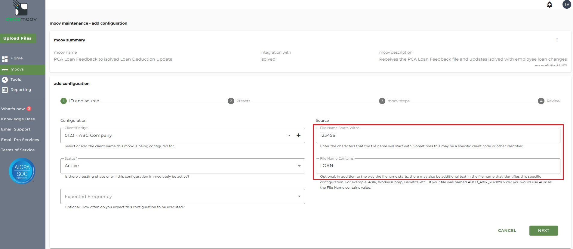 This article describes how to configure a client for the PCA Loan Feedback to isolved Loan Deduction Update moov definition used for 360 integration. Each client configuration will vary based on their plan specification and will need to be configured accordingly.