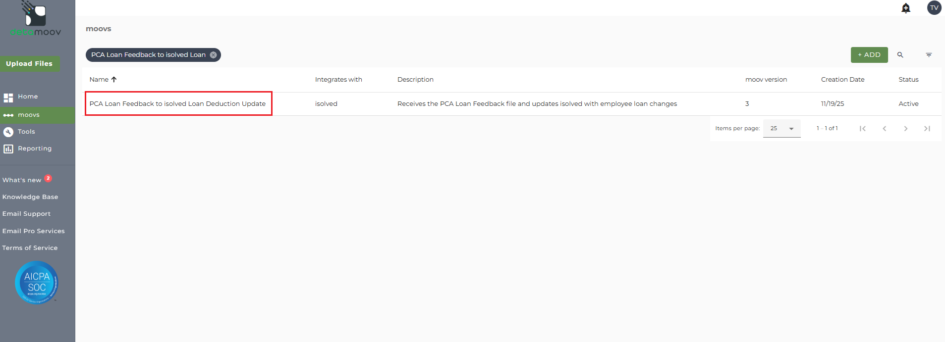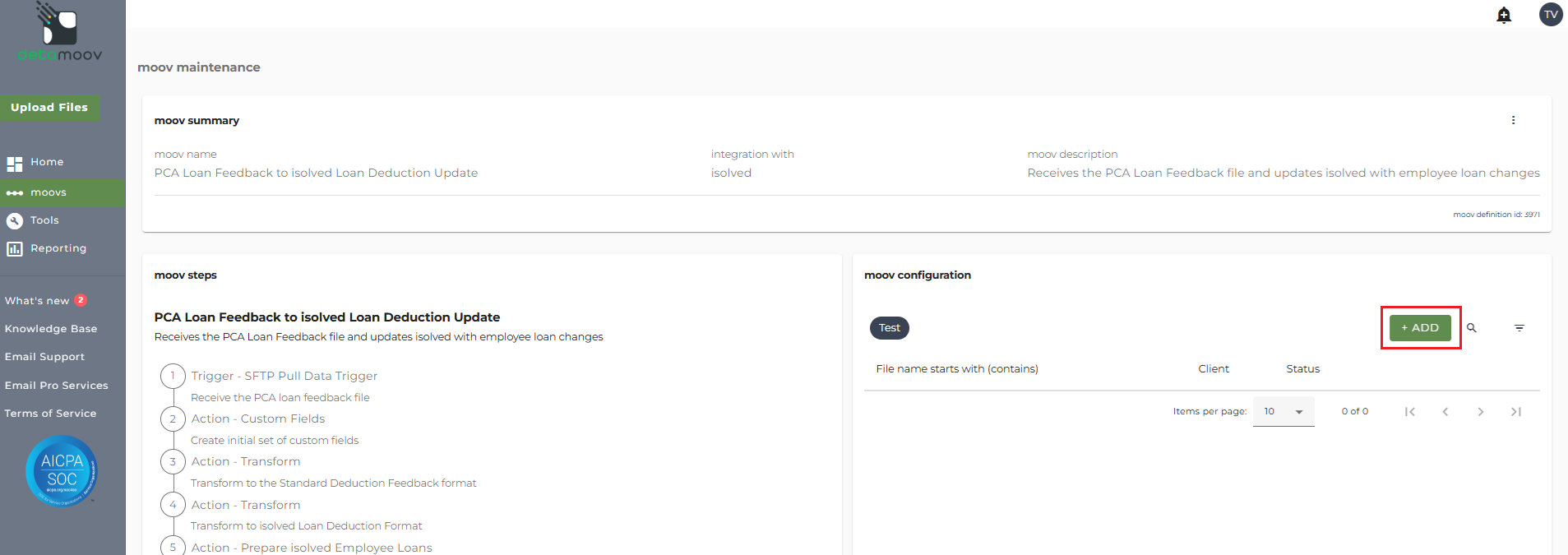Once the PCA Loan Feedback to isolved Loan Deduction Update moov has been added to your account, access the moovs section on the left side menu and click on the PCA Loan Feedback to isolved Loan Deduction Update moov.