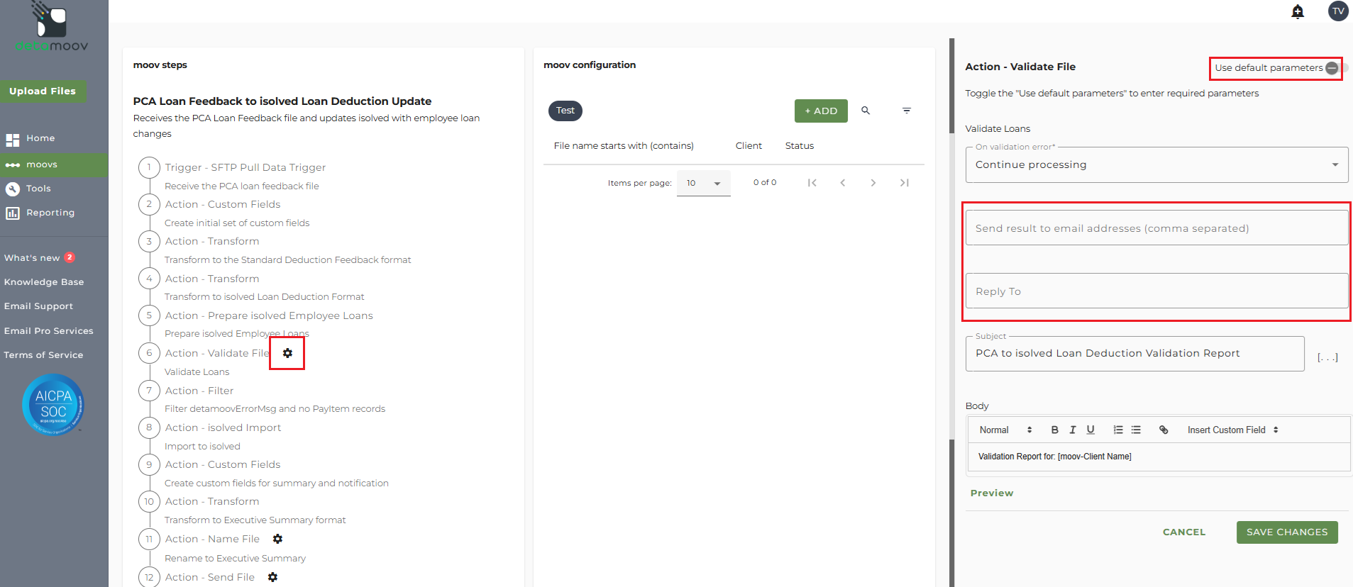 To ensure that you receive the validation notifications, click the cog icon under the step 6: Action - Validate Files on the left. Then toggle the "Use default parameters" off and enter in the email addresses you would like to receive the notification. If you would like to enter multiple email addresses, separate them with a comma. A Reply to email is also required in the event that a recipient of the notification replies to the email.