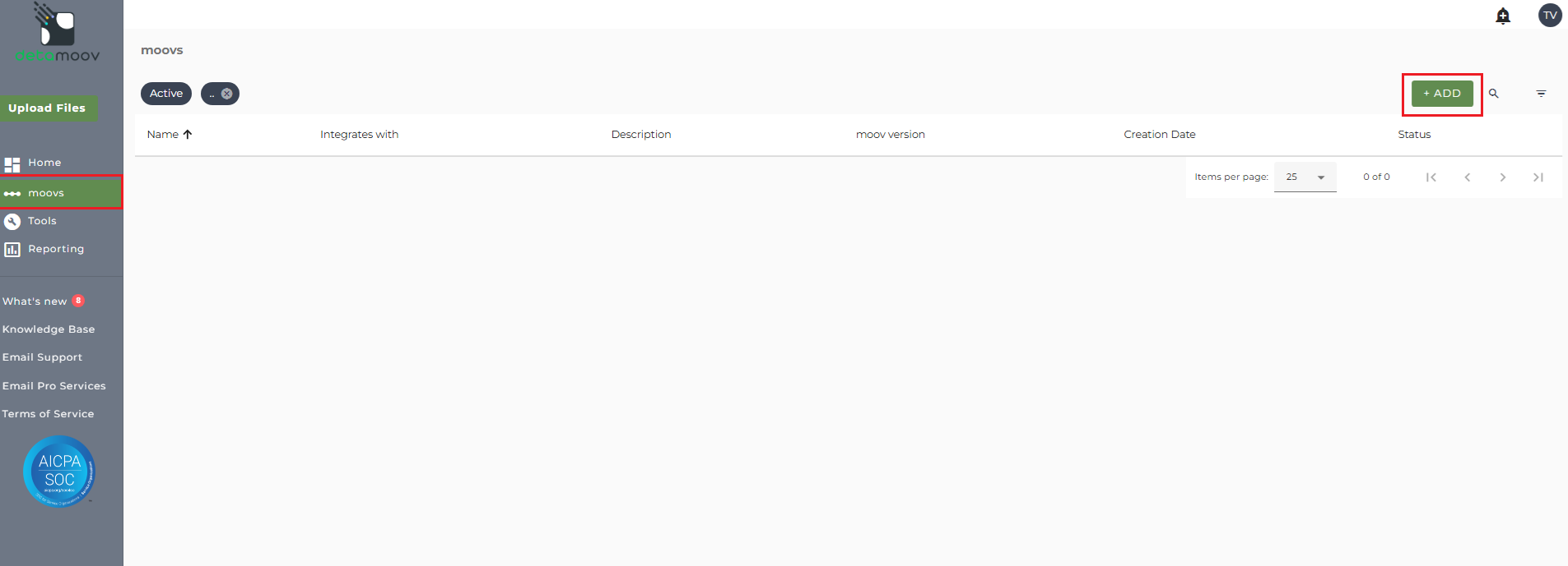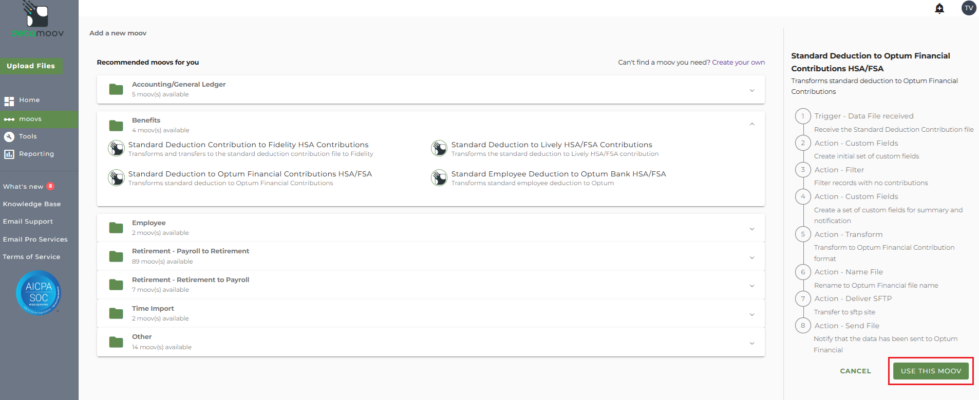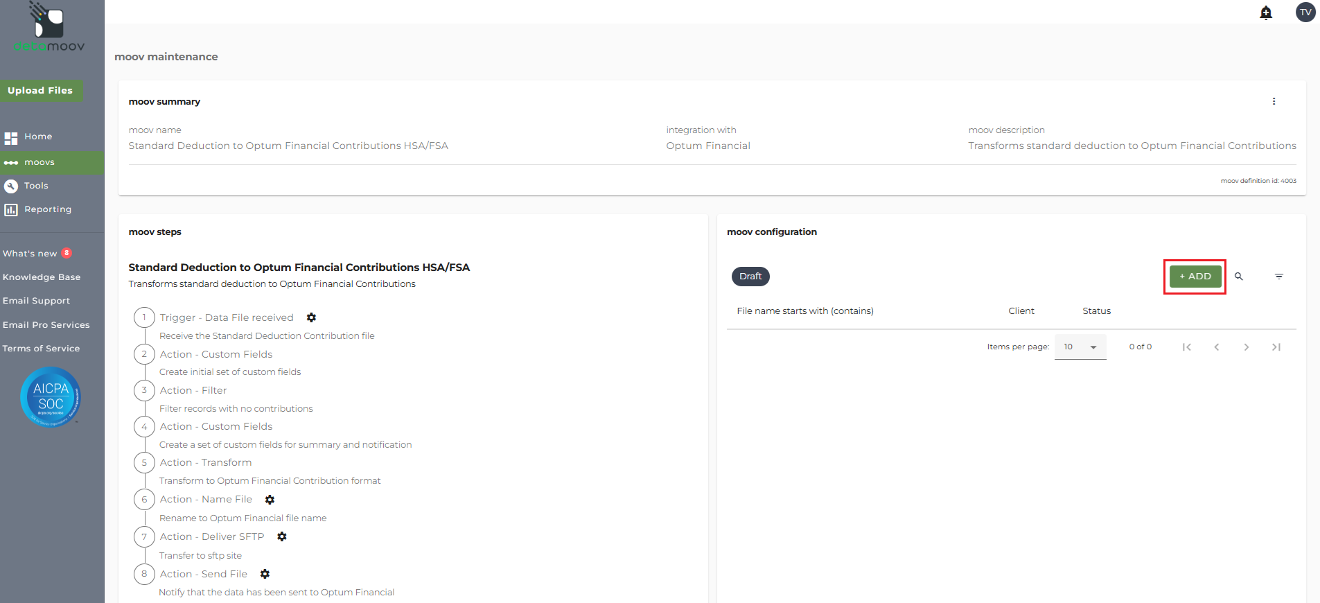 To adopt the Standard Deduction to Optum Financial HSA/FSA Contributions moov to your account, click on the moovs section on the left and click the ADD button.