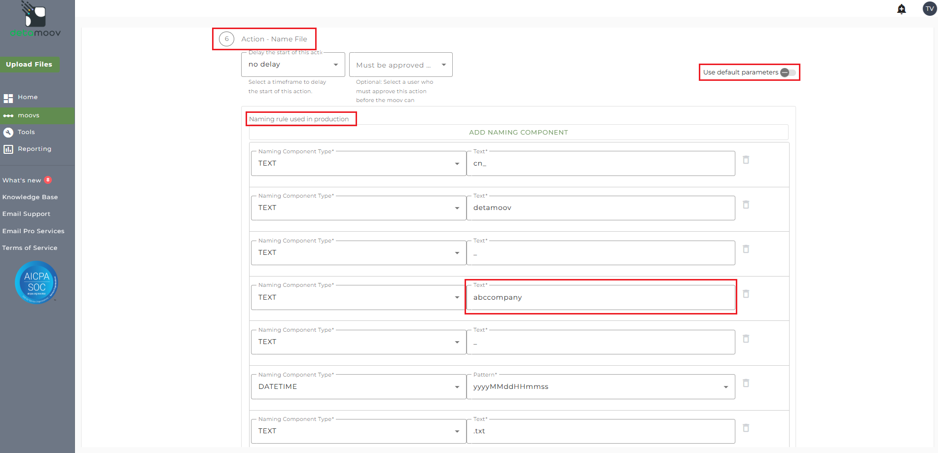To override this value, locate the Action - Name File step, toggle the 'Use default parameters' off and replace the text '[clientname - override]' with the plan's Remittance Group value. This value will need to be replaced in both the 'Naming rule used in production' and 'Naming rule used in test' sections.