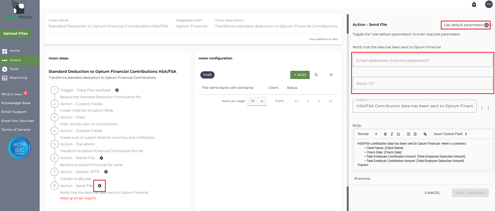 The Standard Deduction to Optum Financial HSA/FSA Contributions moov provides a notification for when the moov is complete. The notification can be sent to any email address you wish and can also be configured to send to multiple email addresses.
