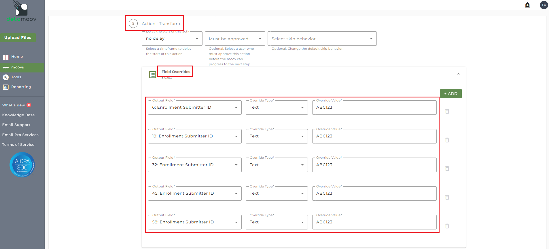 To include the Enrollment Submitter ID value, you will need to add a Field Override. Locate the Action - Transform step, expand the Field Overrides panel and click the Add button. The Standard Deduction to Optum Financial HSA/FSA Contributions moov will potentially create multiple output records from a single input record. To ensure the Enrollment Submitter ID value is passed correctly, you will need to create a field override for the following fields: