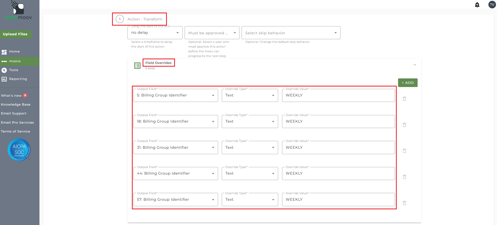 To include the Billing Group Identifier value, you will need to add a Field Override. Locate the Action - Transform step, expand the Field Overrides panel and click the Add button. The Standard Deduction to Optum Financial HSA/FSA Contributions moov will potentially create multiple output records from a single input record. To ensure the Enrollment Submitter ID value is passed correctly, you will need to create a field override for the following fields: