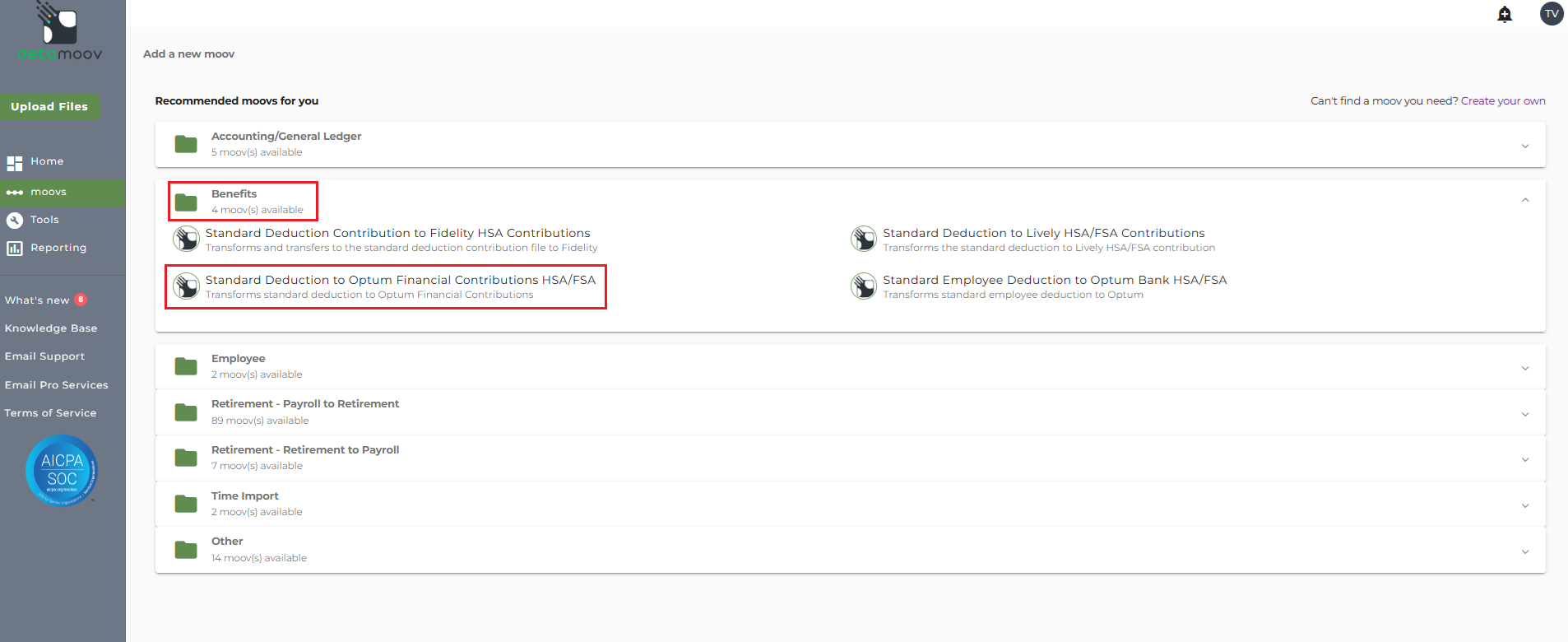 Once the Standard Deduction to Optum Financial HSA/FSA Contributions moov has been added to your account, click on the Standard Deduction to Optum Financial HSA/FSA Contributions moov.