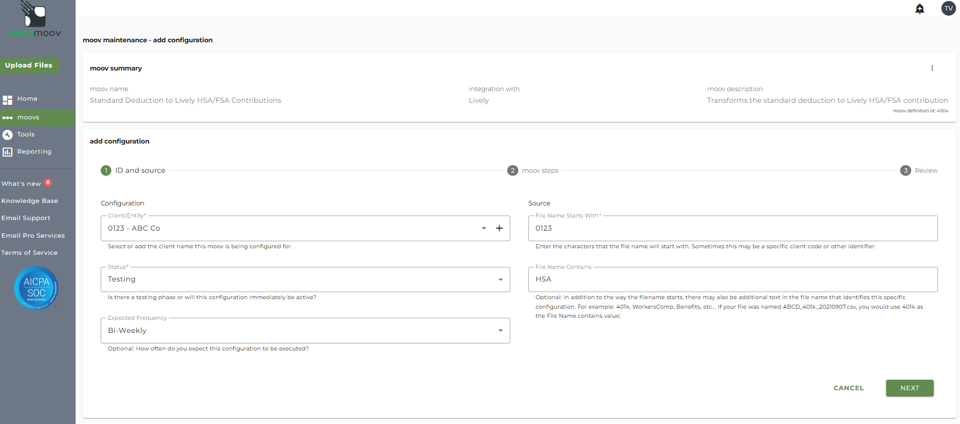 This article describes how to configure a client for the Standard Deduction to Lively Financial HSA/FSA Contributions moov definition. Each client configuration will vary based on their plan specification and will need to be configured accordingly.