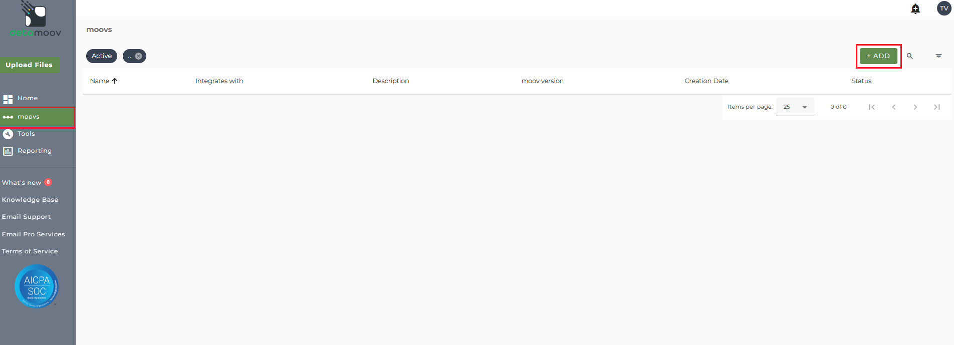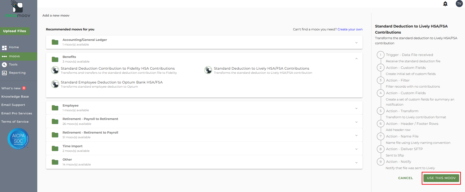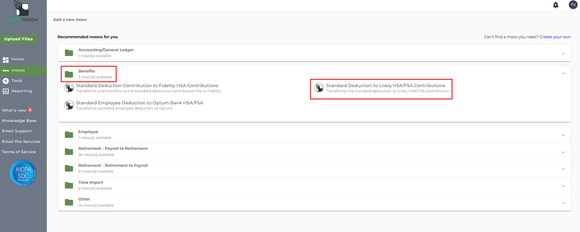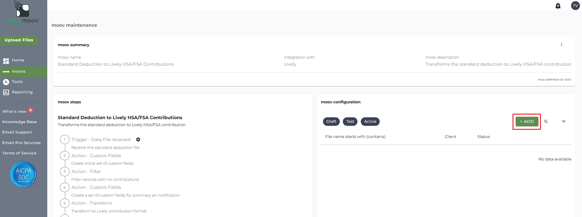 To adopt the Standard Deduction to Lively HSA/FSA Contributions moov to your account, click on the moovs section on the left and click the ADD button.