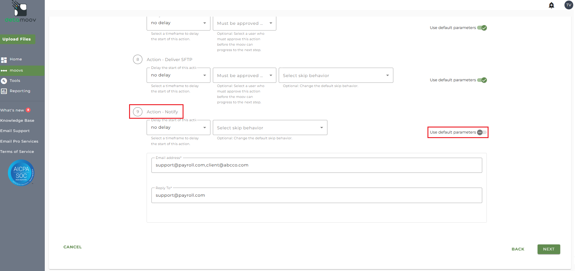 Note: these settings apply to any client configuration you set up for this specific moov. You also have the ability to configure the notification step for each client configuration if you wish to add or remove email addresses per client.