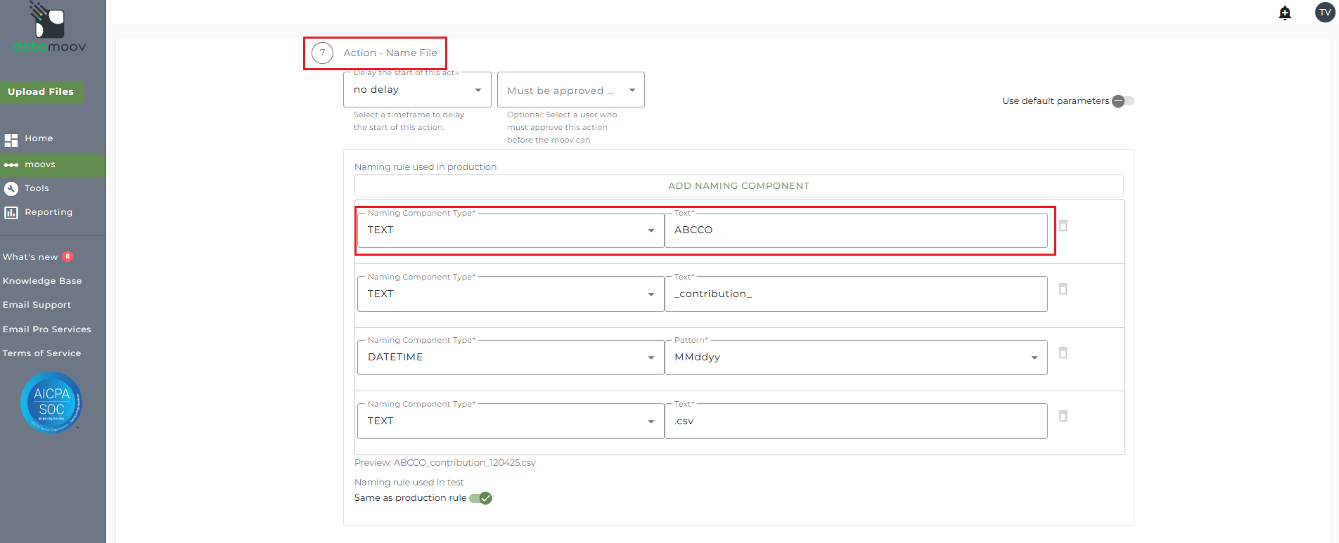 The name of the file sent to Lively requires the Company Name of your client. To override this value, locate the Action - Name File step, toggle the 'Use default parameters' off and replace the text '[Company Name - override]' with the plan's Remittance Group value. This value will need to be replaced in both the 'Naming rule used in production' and 'Naming rule used in test' sections.