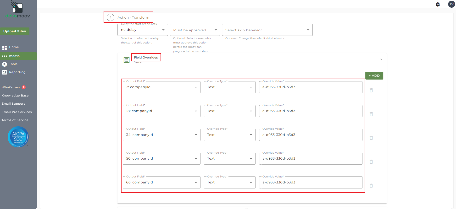To include the Billing Group Identifier value, you will need to add a Field Override. Locate the Action - Transform step, expand the Field Overrides panel and click the Add button. The Standard Deduction to Lively HSA/FSA Contributions moov will potentially create multiple output records from a single input record. To ensure the companyId value is passed correctly, you will need to create a field override for the following fields: