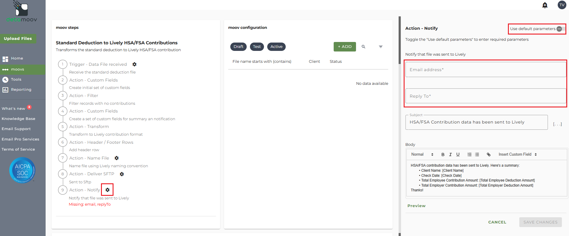 The Standard Deduction to Lively HSA/FSA Contributions moov provides a notification for when the moov is complete. The notification can be sent to any email address you wish and can also be configured to send to multiple email addresses.
