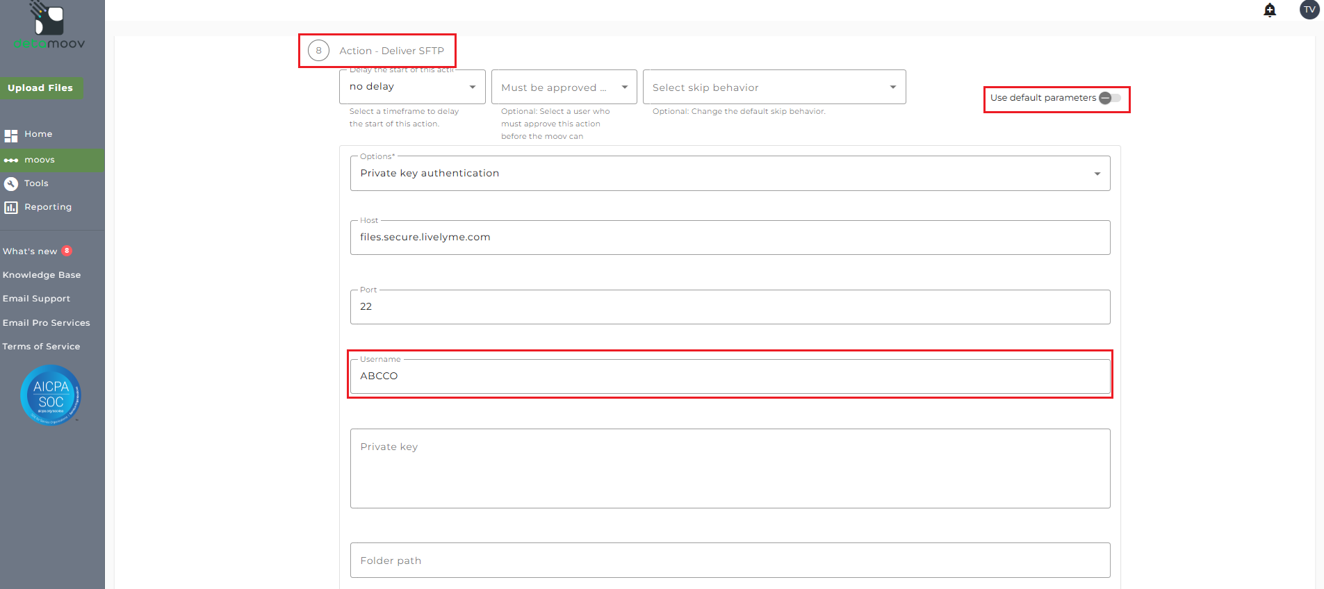 To override the SFTP parameters, locate the Action - Delivery SFTP step, toggle the 'Use default parameters' off and enter in your client's Username. No other fields or values should be entered or modified.