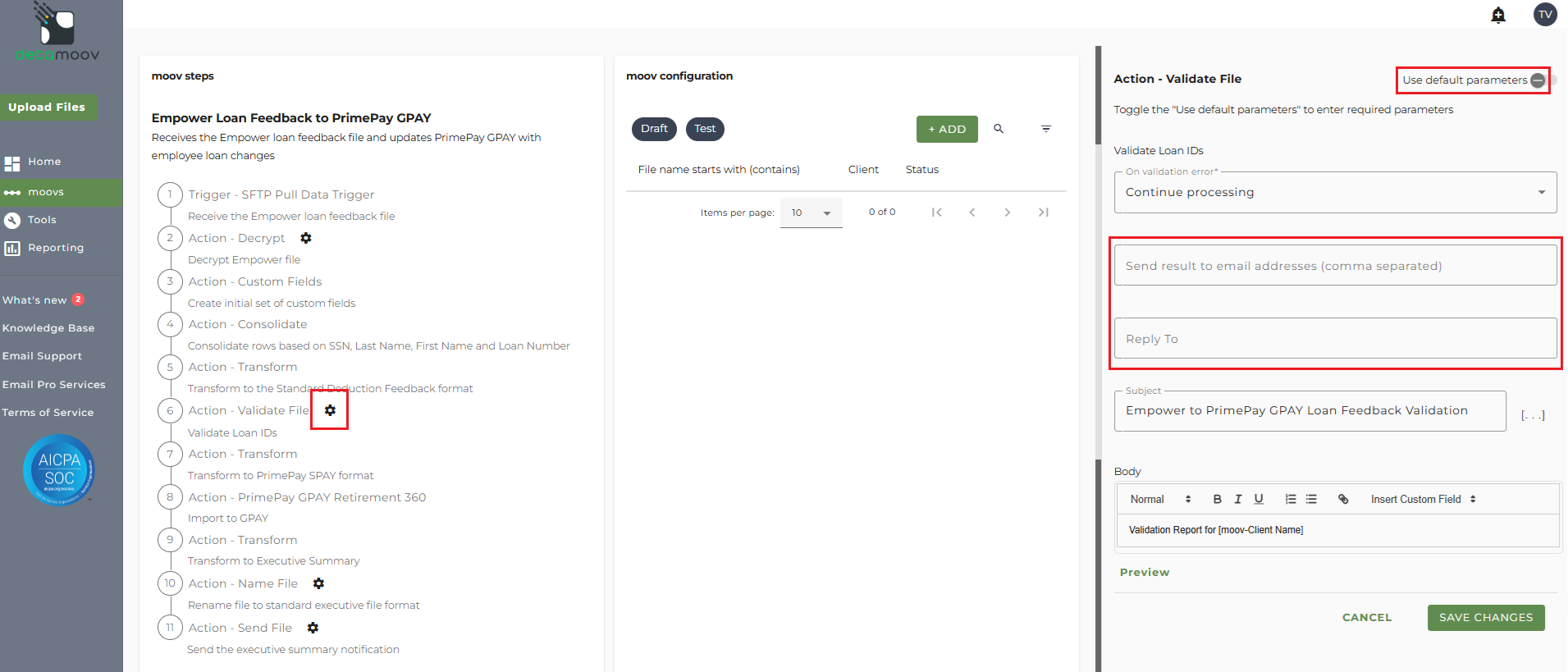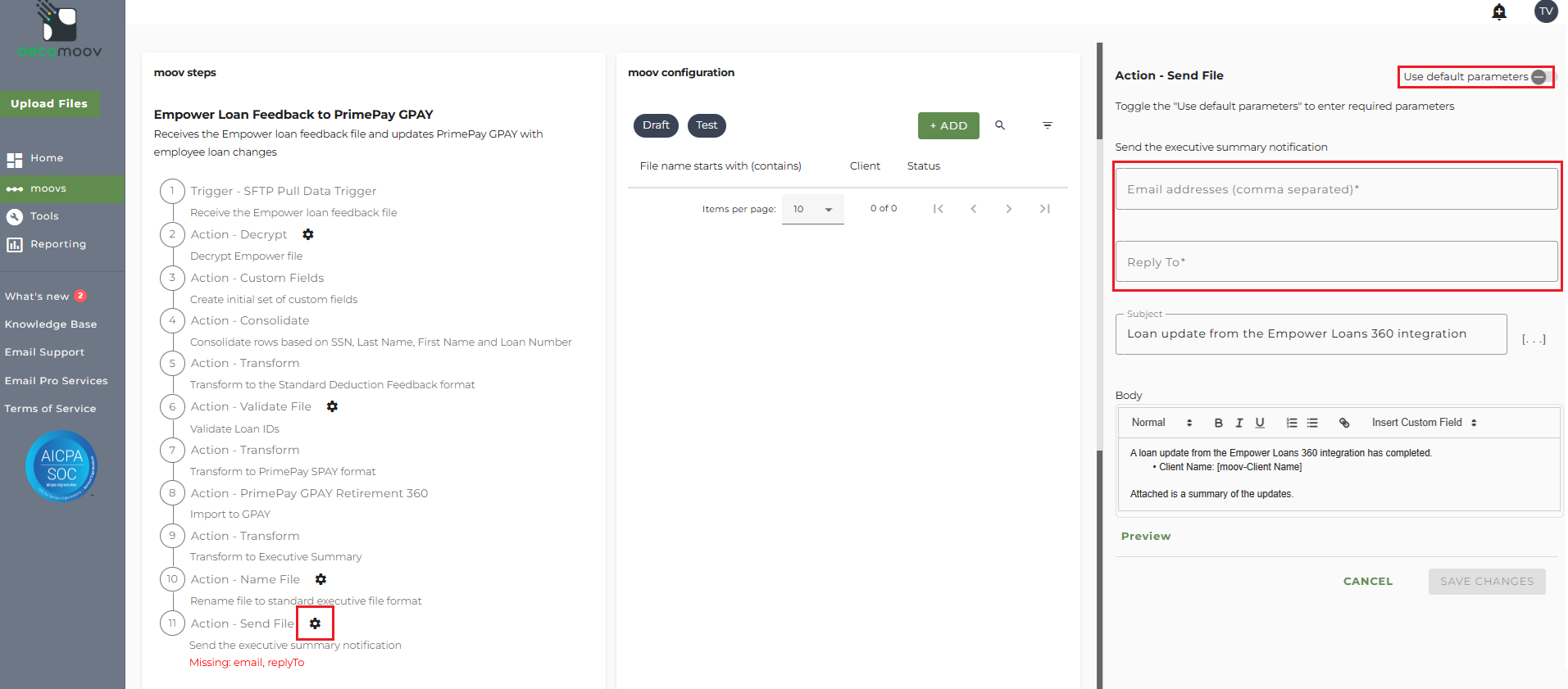 Note: these settings apply to any client configuration you set up for this specific moov. You also have the ability to configure the send file step for each client configuration if you wish to add or remove email addresses per client.