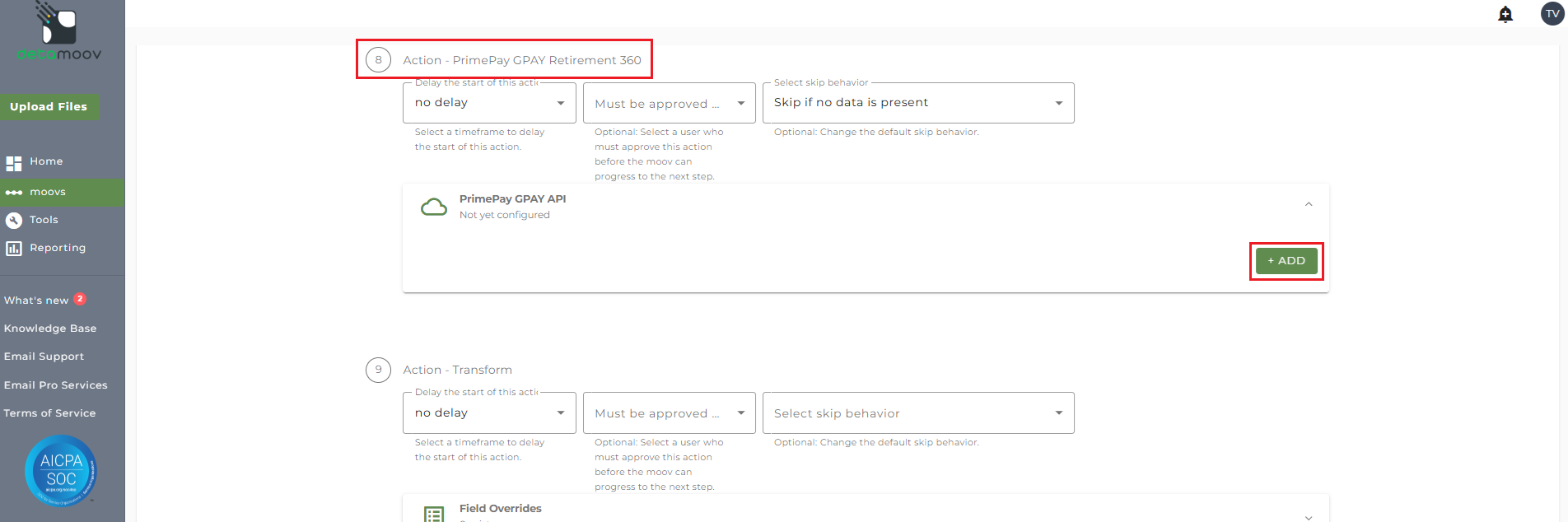 To configure the PrimePay GPAY Retirement 360 step for you client, locate the Action - PrimePay GPAY Retirement 360 step, expand the PrimePay GPAY API panel and click ADD.