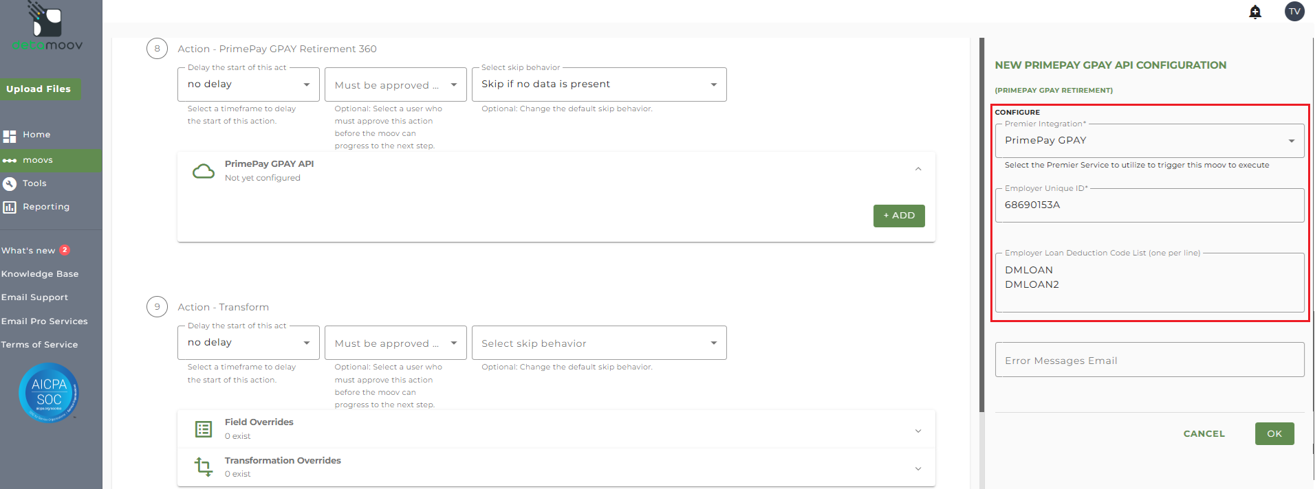 The Empower Loan Feedback to PrimePay GPAY moov provides a notification once the moov is complete with a summary of the retirement plan changes that were made in PrimePay GPAY. The notification can be sent to any email address you wish and can also be configured to send to multiple email addresses.