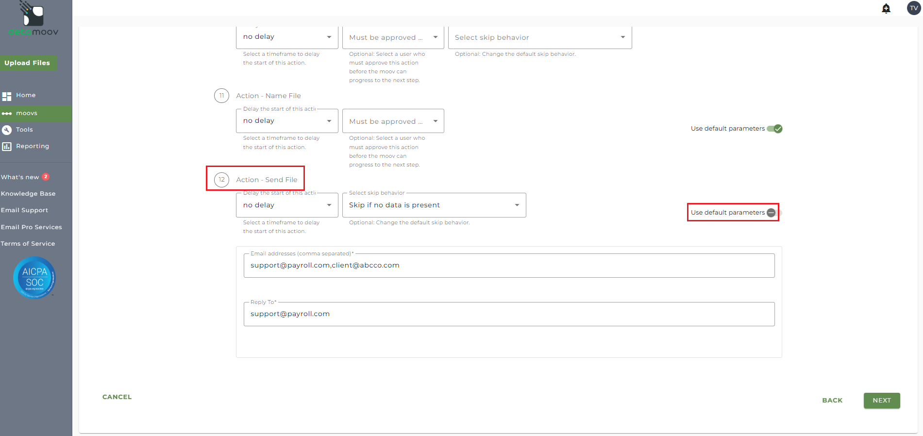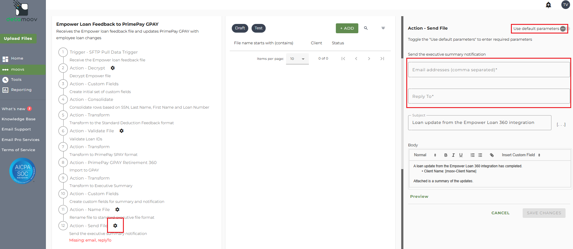 Note: these settings apply to any client configuration you set up for this specific moov. You also have the ability to configure the send file step for each client configuration if you wish to add or remove email addresses per client.