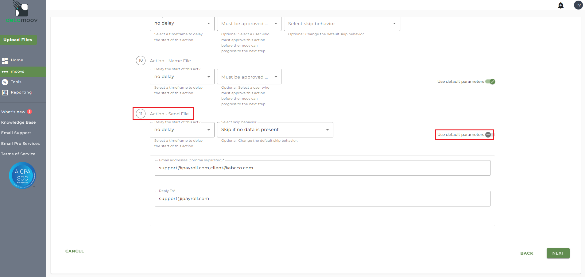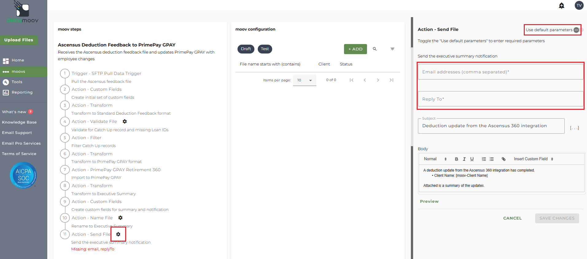 Note: these settings apply to any client configuration you set up for this specific moov. You also have the ability to configure the send file step for each client configuration if you wish to add or remove email addresses per client.